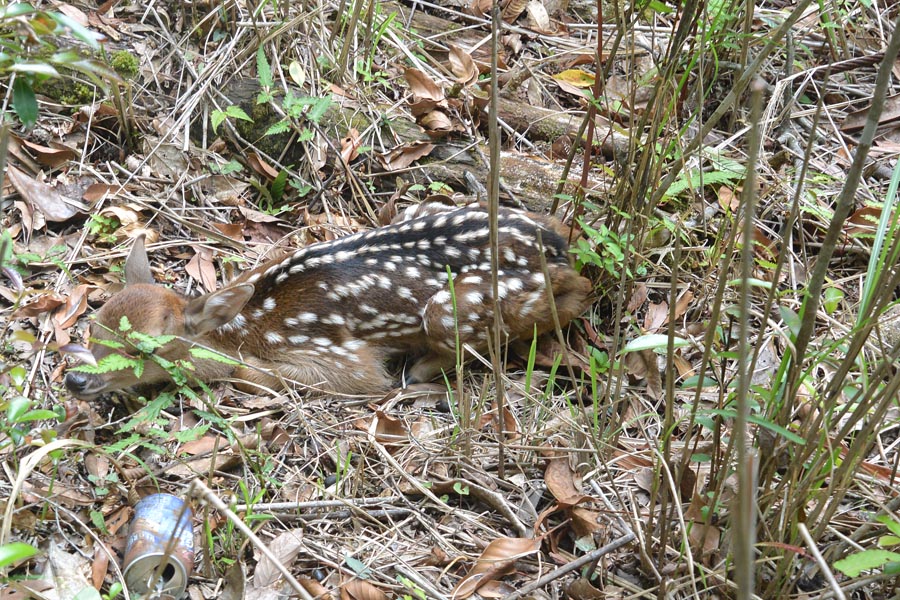 私からは葉が邪魔で小鹿の目が見えないので少し横にづって写真を撮りました。